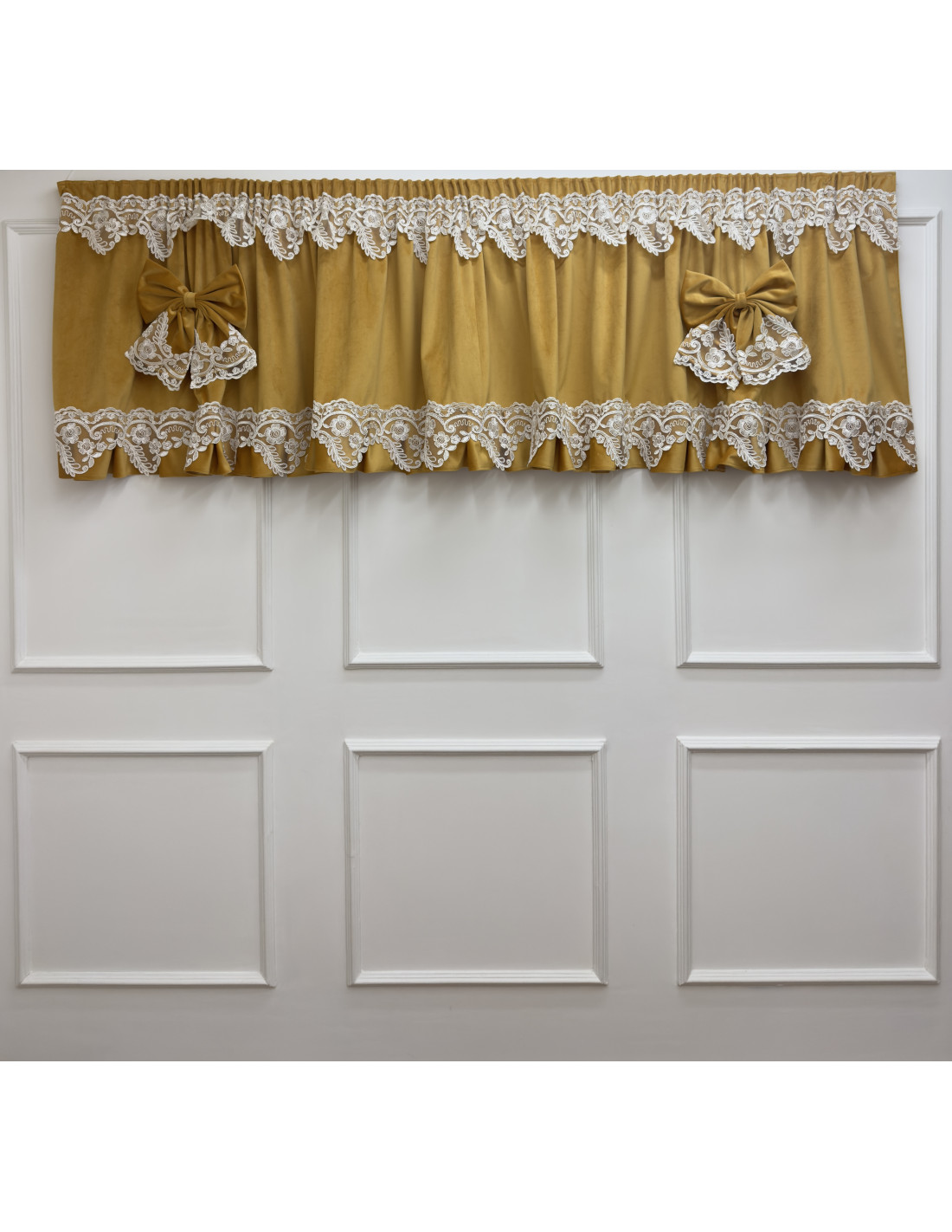 Raffina i tuoi ambienti con la nostra mantovana in velluto oro, realizzata artigianalmente e rifinita con una morbida volà e prezioso pizzo rebrodé.