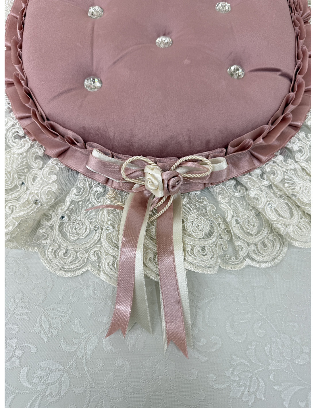 Il prodotto presenta una morbida imbottitura decorata con bottoni Swarovski e un fiocco centrale bicolore panna e rosa , anch’esso arricchito da un punto luce Swarovski, per un risultato prezioso e ricercato.