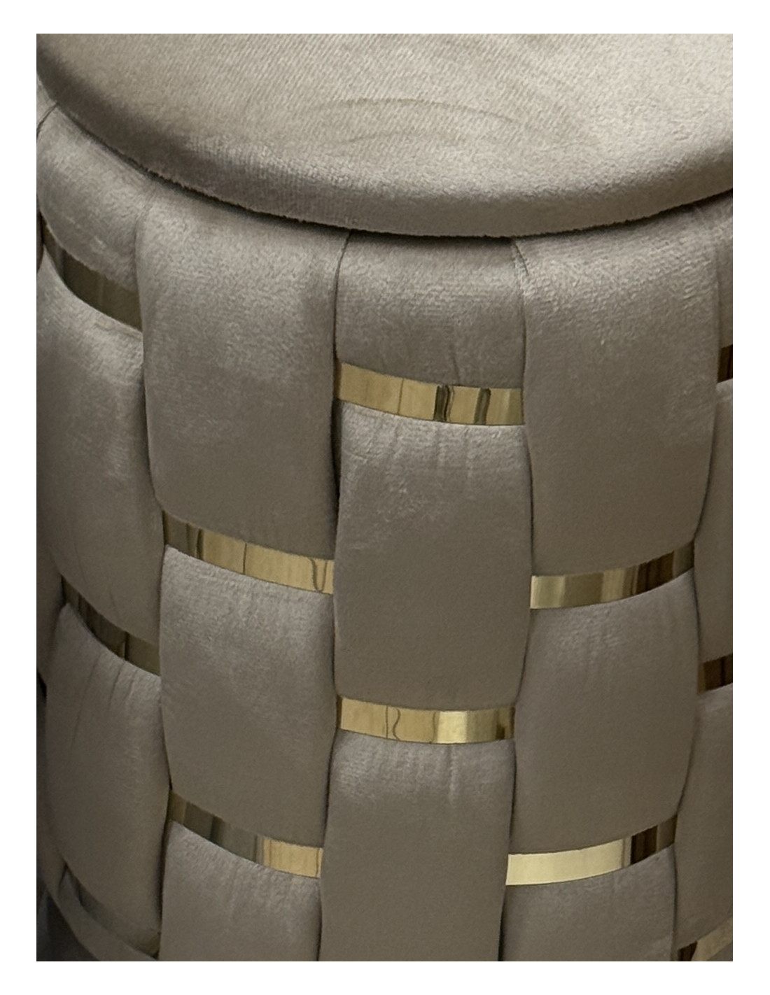 Realizzati con rivestimento effetto velluto tortora intenso e caratterizzati da un raffinato intreccio con inserti oro lucido, questi pouf uniscono design contemporaneo e praticità.