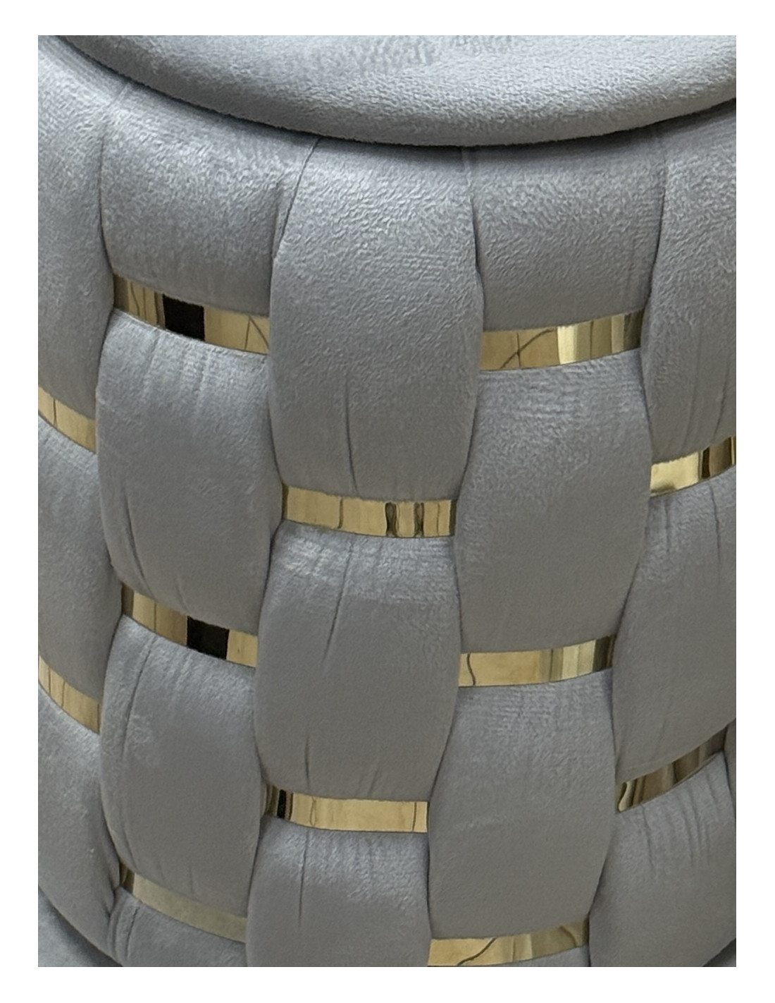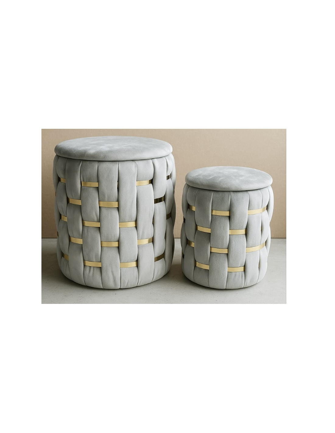Realizzati con rivestimento effetto velluto grigio intenso e caratterizzati da un raffinato intreccio con inserti oro lucido, questi pouf uniscono design contemporaneo e praticità.