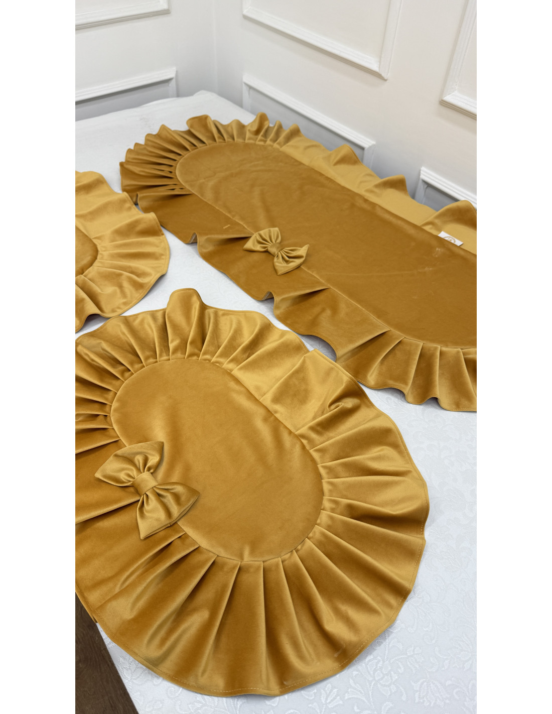 Raffinato e luminoso, il Tris Centri in velluto oro è pensato per impreziosire la tavola e gli arredi con un tocco di eleganza senza tempo.