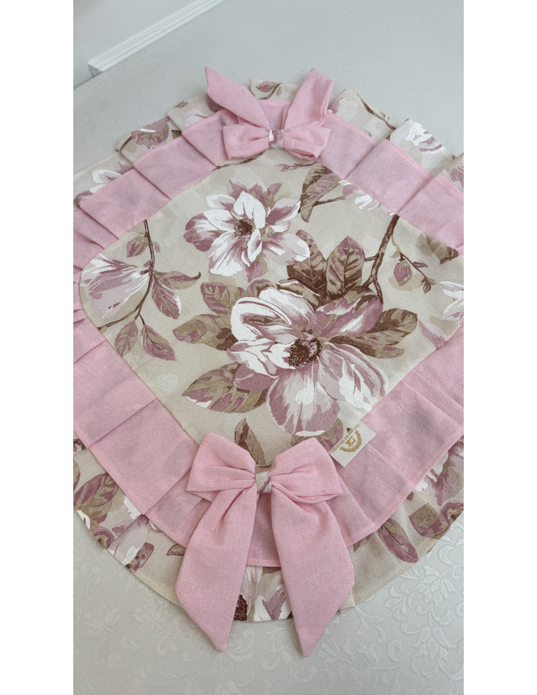 Il design è impreziosito da una raffinata rifinitura con doppio volant in cotone, che incornicia il coprifornello con eleganza e movimento. A completare il tutto troviamo un fiocco decorativo in cotone, dettaglio distintivo dello stile romantico della collezione.
