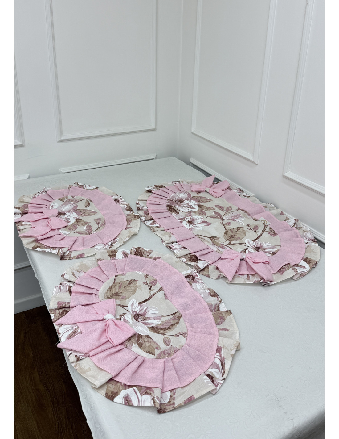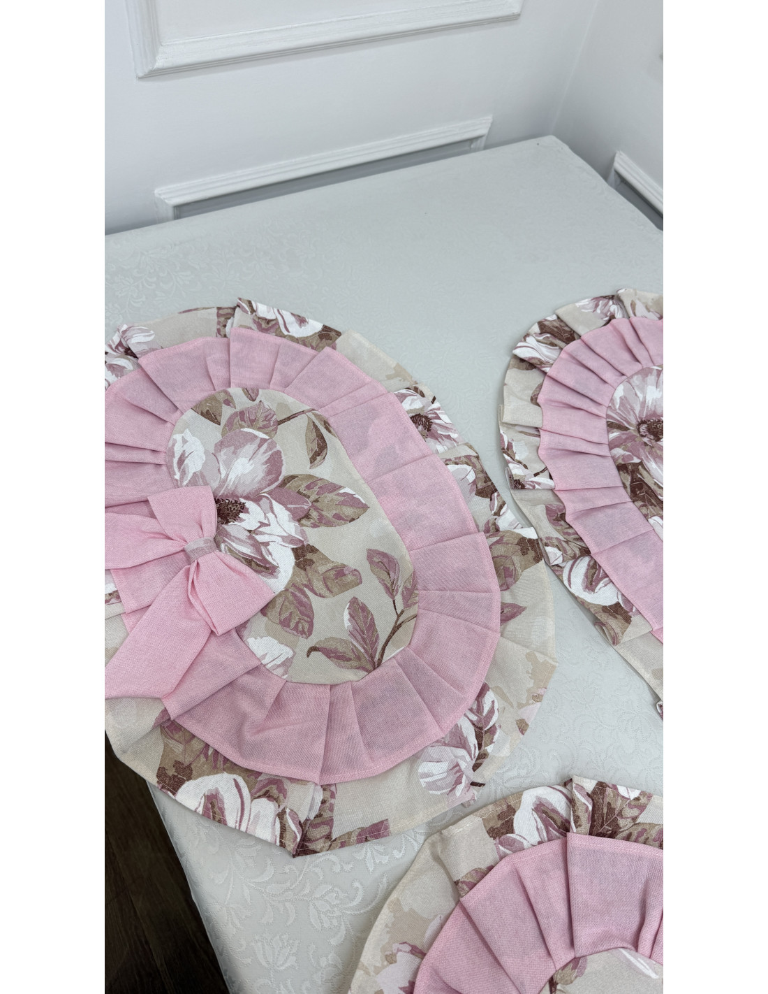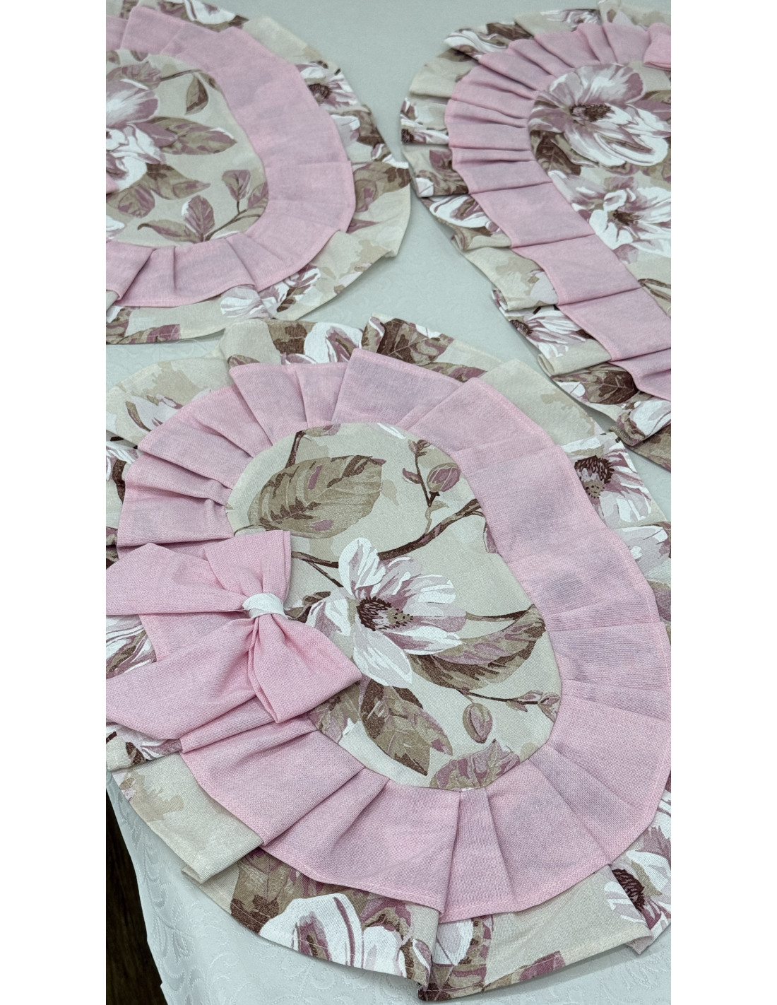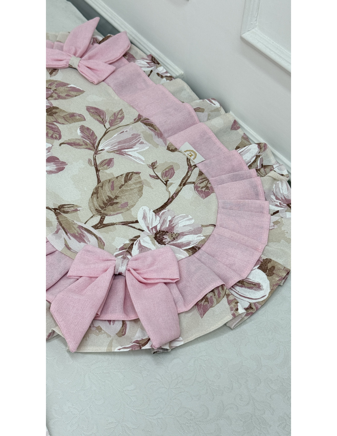 Ogni centro è rifinito con un elegante doppio volant in cotone, che incornicia il tessuto con movimento e raffinatezza, ed è impreziosito da un fiocco decorativo in cotone, dettaglio distintivo dello stile romantico e artigianale della collezione.