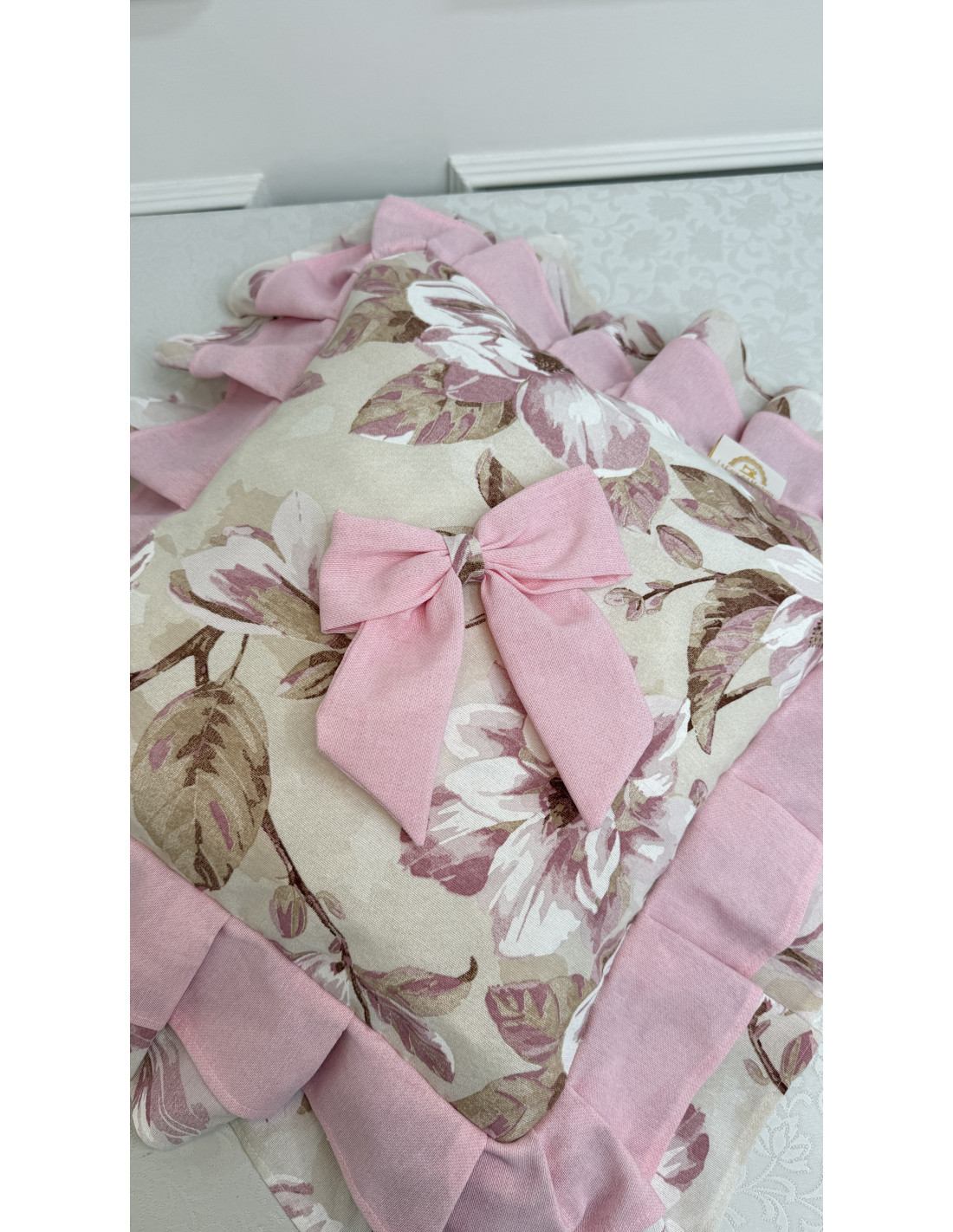 Il design è impreziosito da una raffinata rifinitura con doppio volant in cotone e da un elegante fiocco decorativo in cotone, dettagli che donano movimento e rendono il cuscino un elemento decorativo perfetto per cucina, soggiorno o salotto.