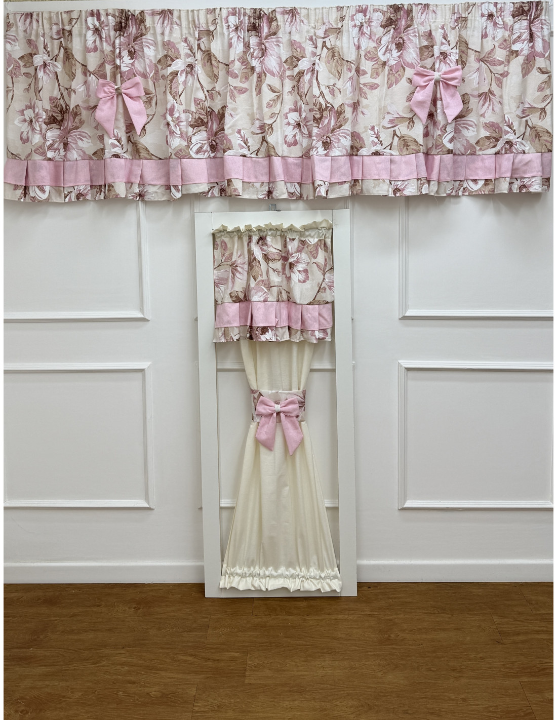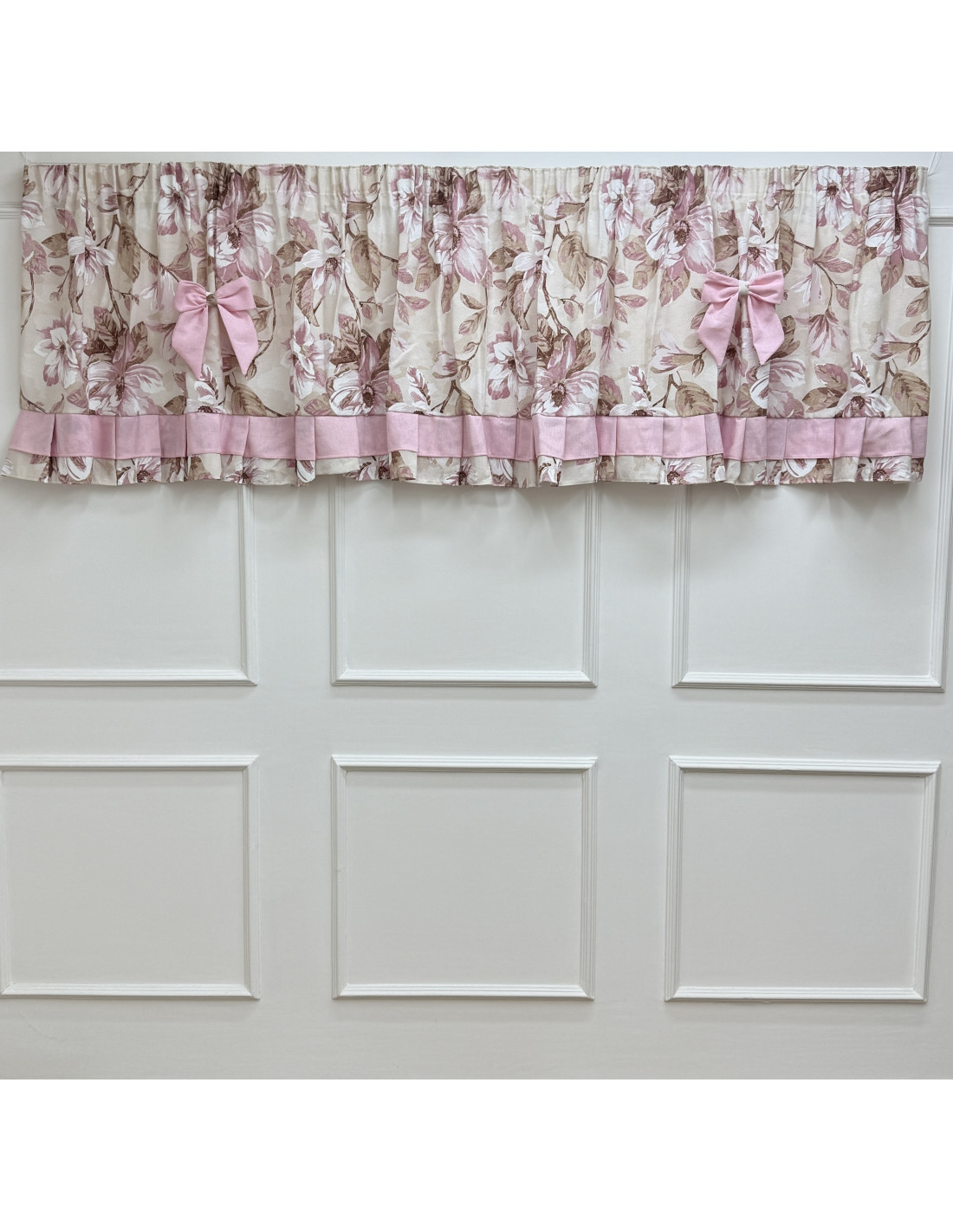 Realizzata in cotone fiorato nei delicati toni del rosa, dona luminosità e armonia alla stanza, coordinandosi perfettamente con gli altri articoli della collezione Petali di Rosa. La parte inferiore è rifinita con un elegante doppio volant in cotone e impreziosita da un fiocco decorativo in cotone, dettagli che rendono la mantovana ricca e decorativa.