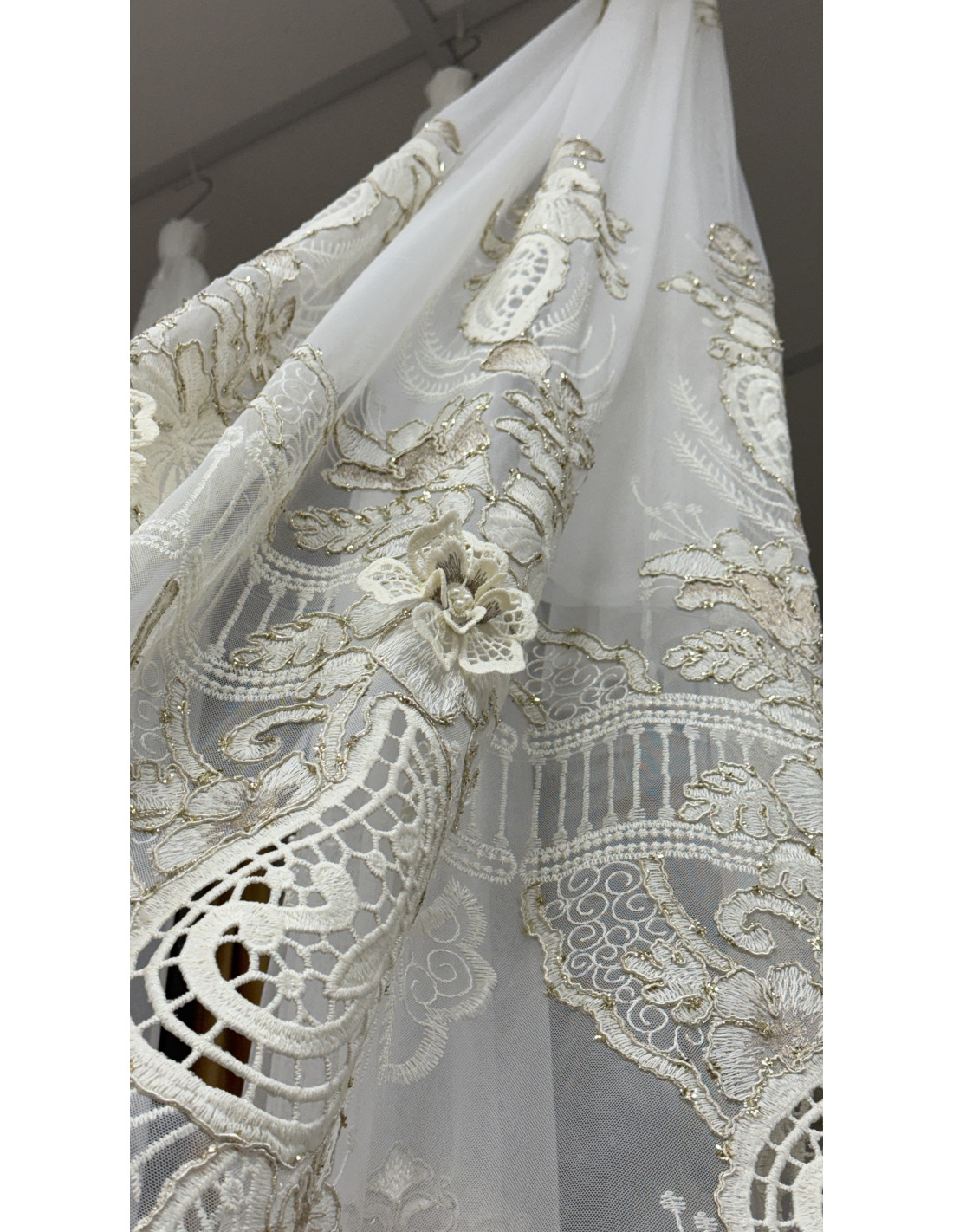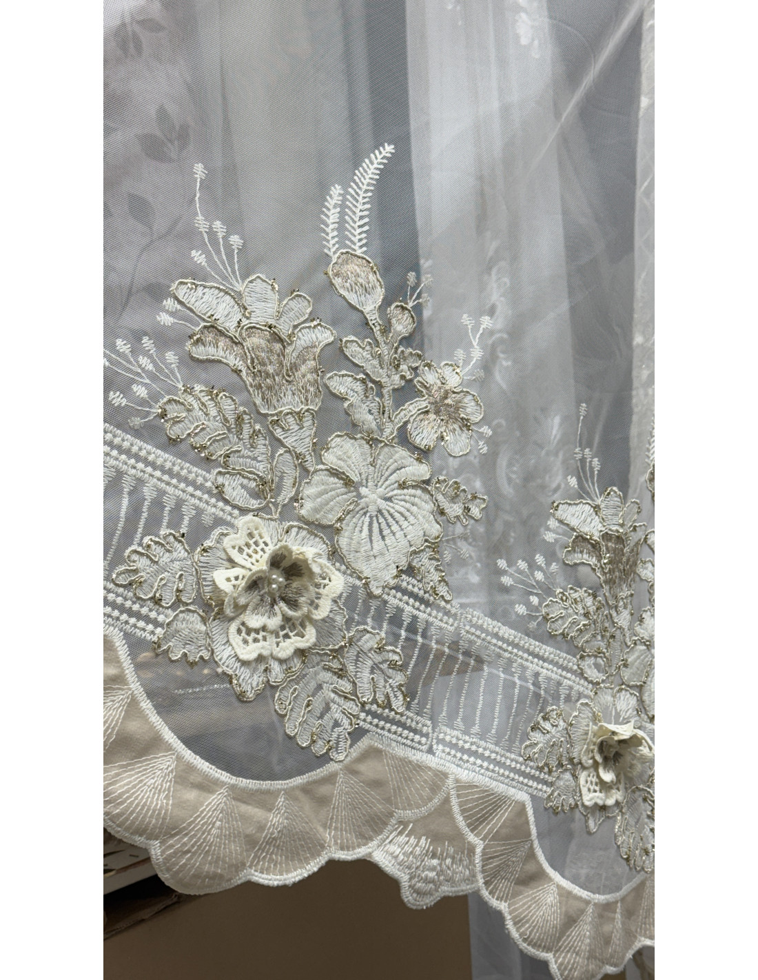 La parte inferiore della tenda è arricchita da ricami floreali importanti e applicazioni decorative, completati da un elegante bordo smerlato lavorato, che rende questa tenda particolarmente raffinata e scenografica.