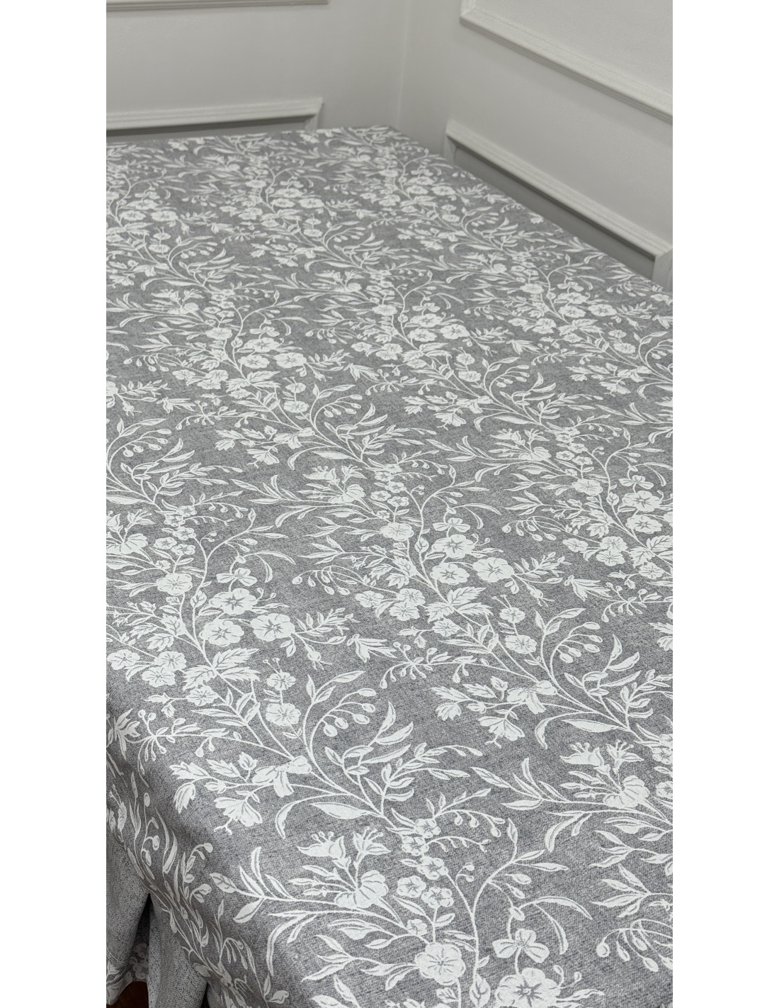 Realizzata in cotone fiorato nei toni del grigio e del bianco, dona luminosità e armonia all’ambiente, creando un’atmosfera accogliente e sofisticata. Il design è valorizzato da una raffinata rifinitura con doppio volant in cotone grigio e fiorato, che incornicia la tovaglia con movimento ed eleganza.