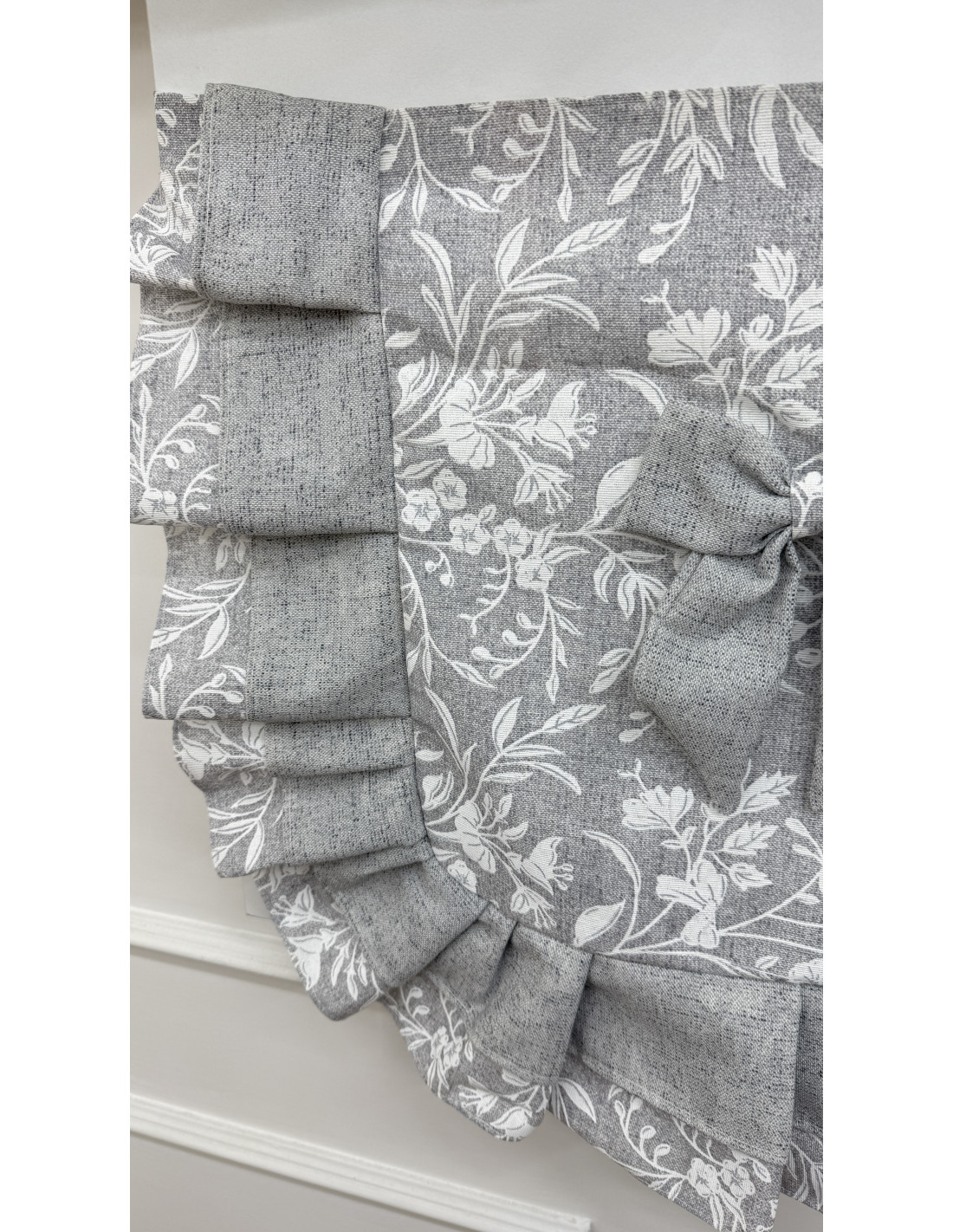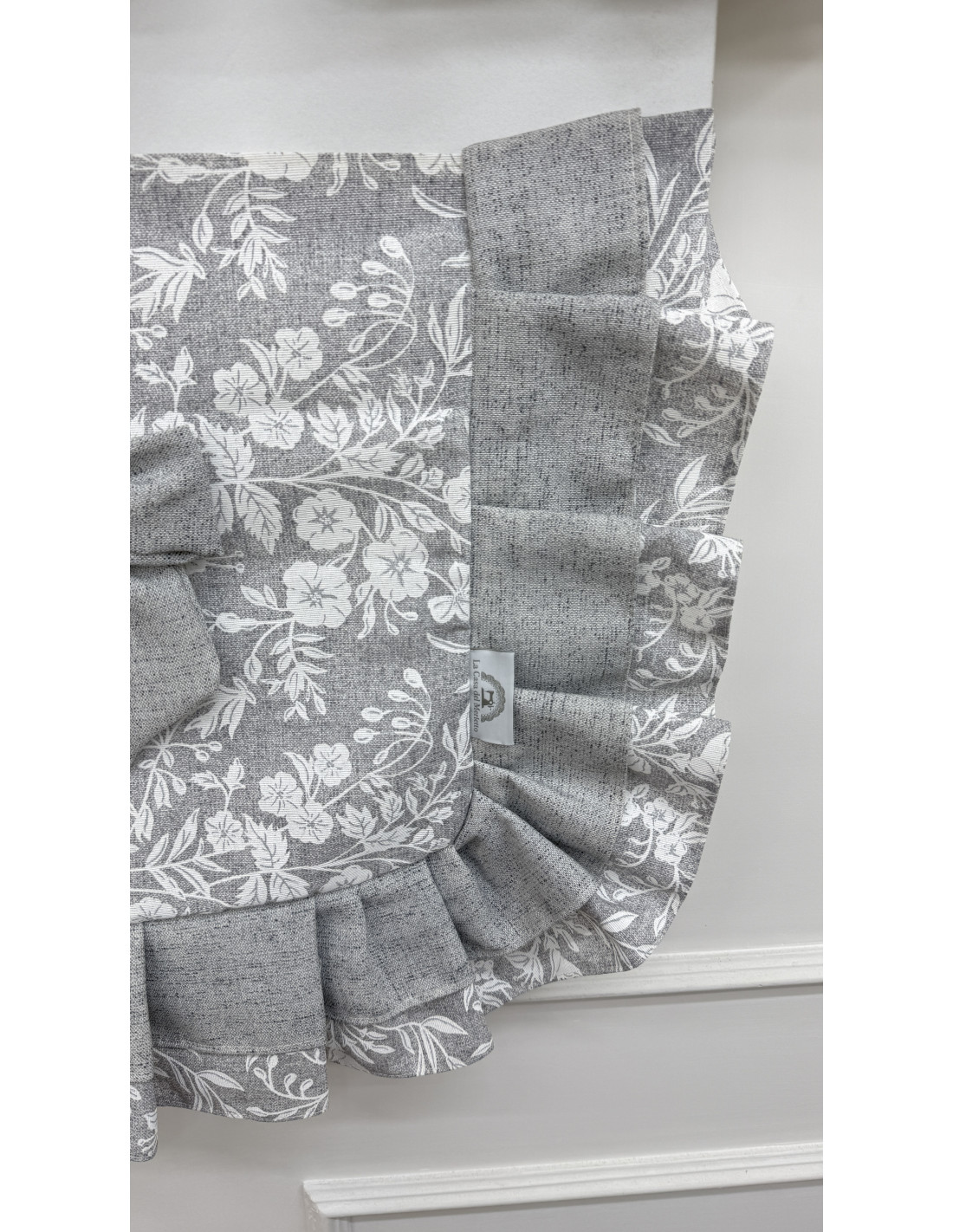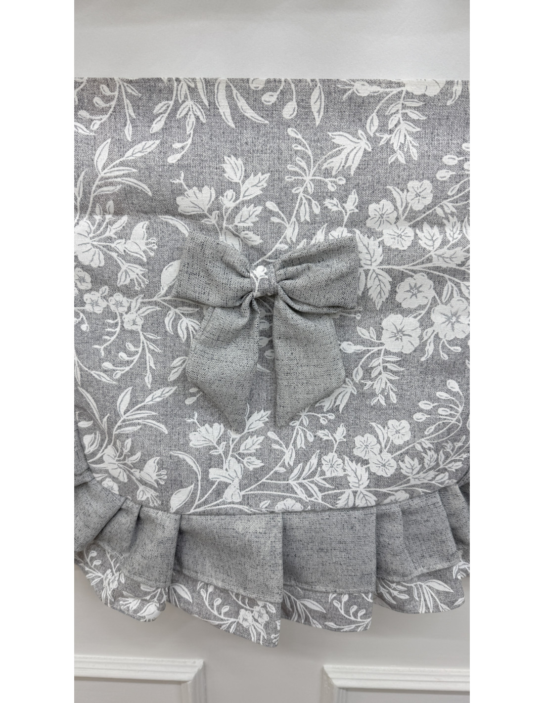Realizzato in cotone fiorato nei toni del grigio e del bianco, è impreziosito da un elegante doppio fiocco decorativo in cotone grigio e cotone fiorato, dettaglio che richiama lo stile romantico e artigianale della collezione Fiore di Perla Grigio.