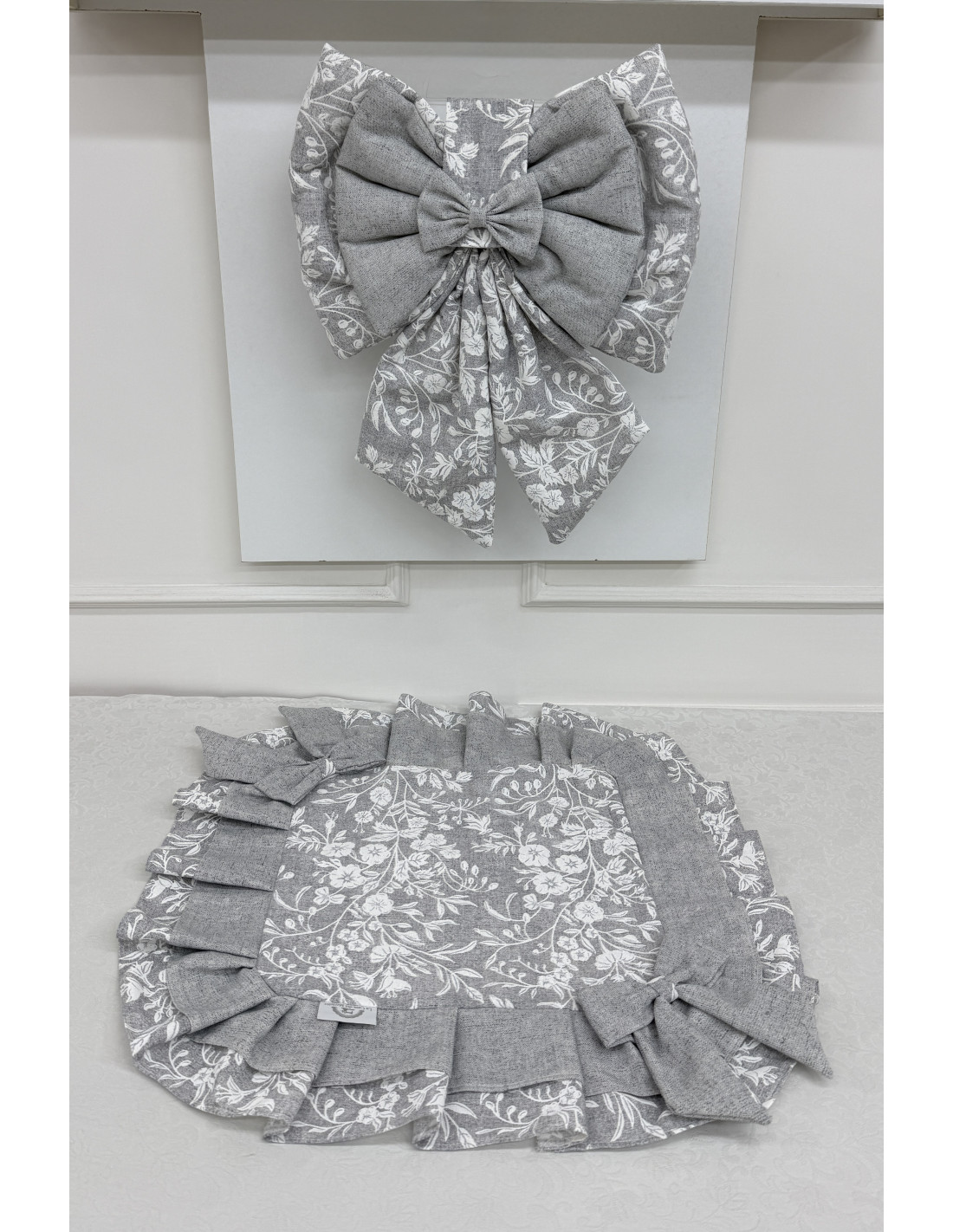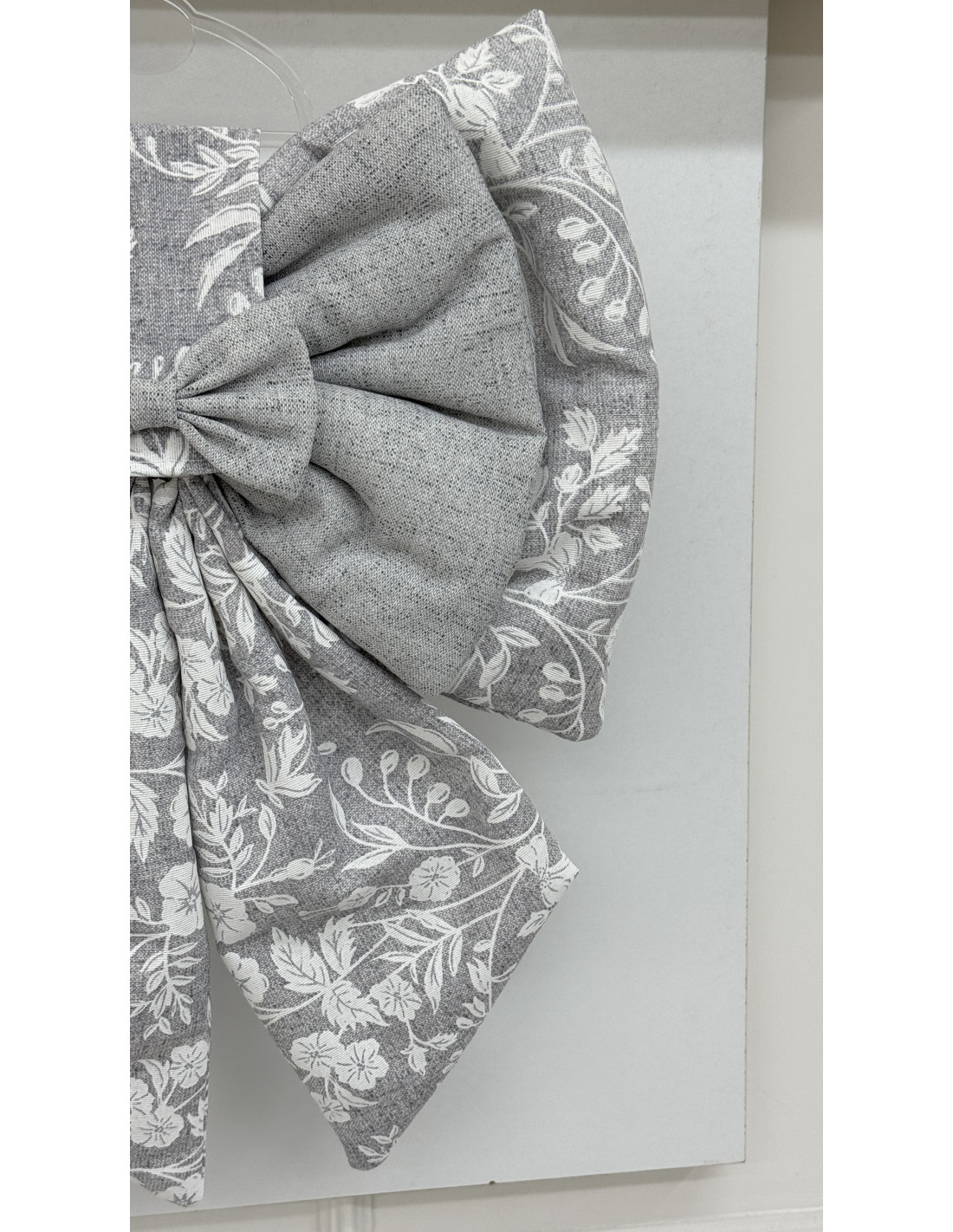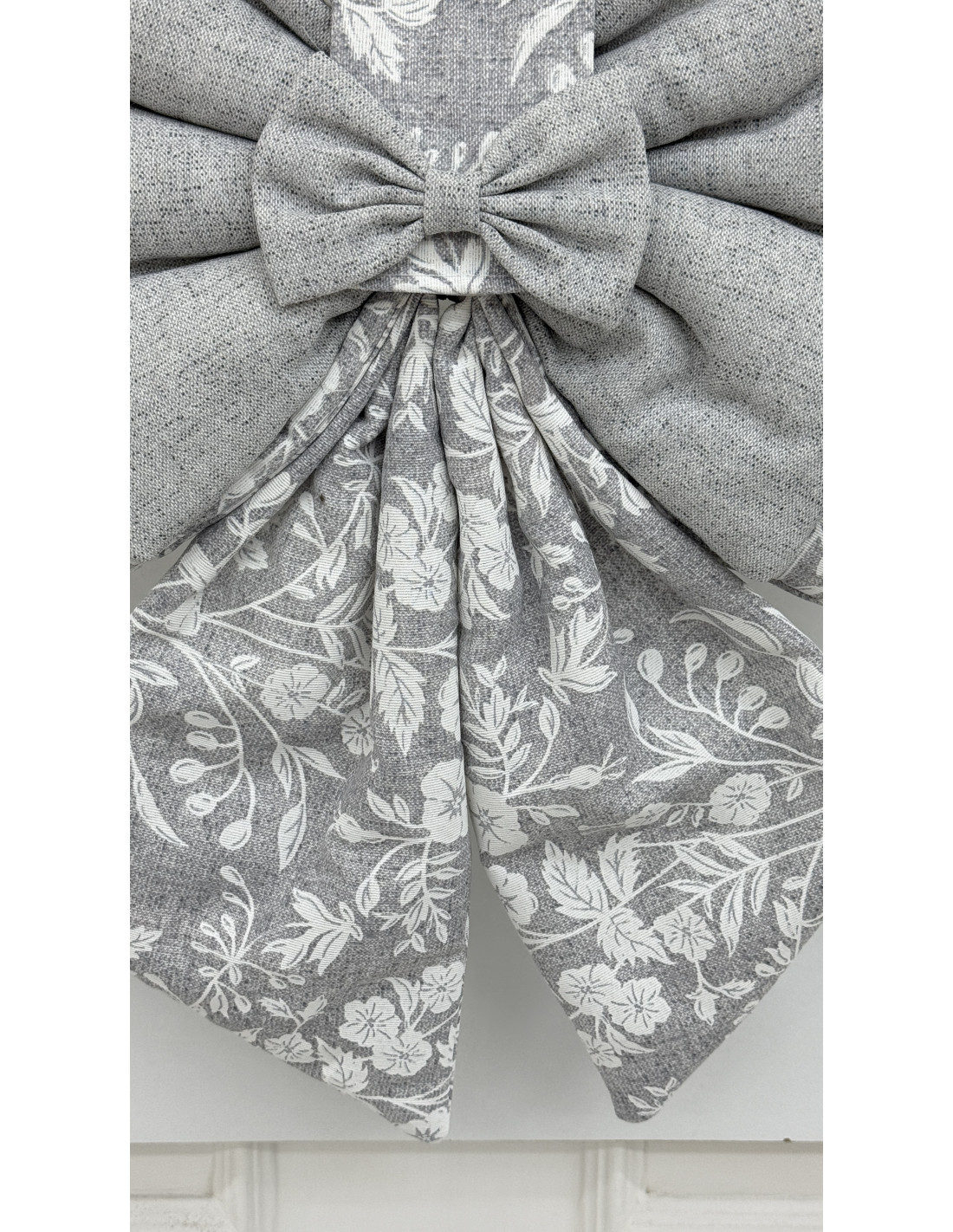 • Decorazione: fiocco in cotone grigio e cotone fiorato