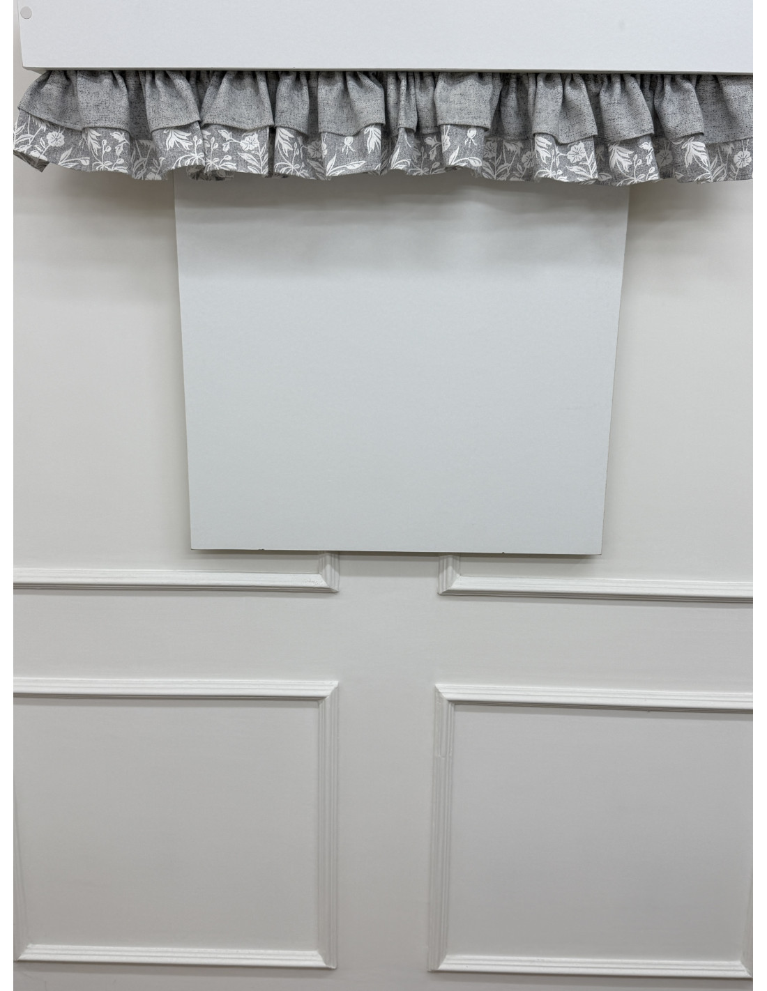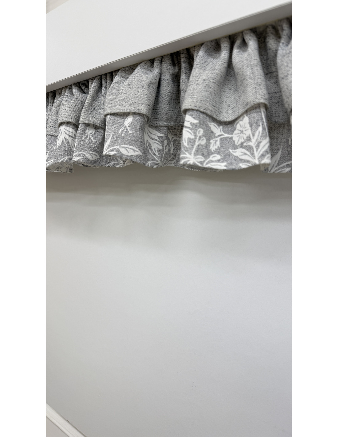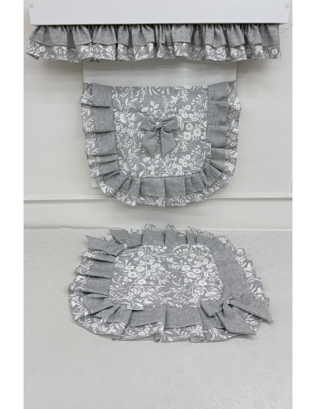 Realizzato in cotone fiorato nei toni del grigio e del bianco, è rifinito con un elegante doppio volant in cotone grigio e fiorato e impreziosito da un fiocco decorativo, dettaglio distintivo della collezione.