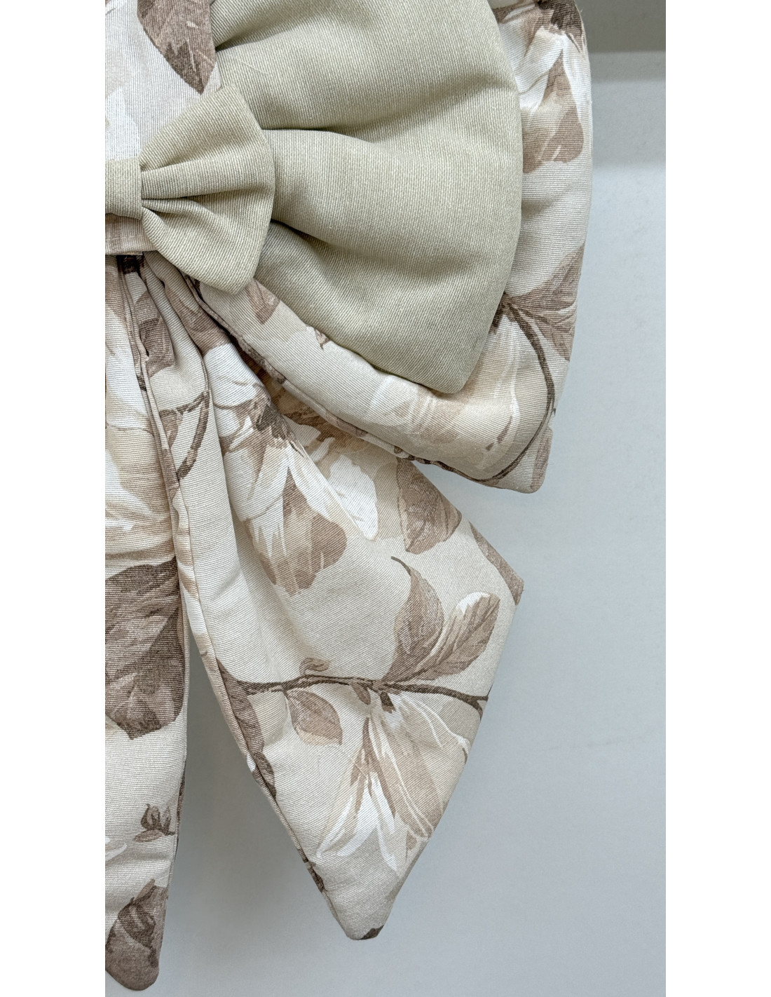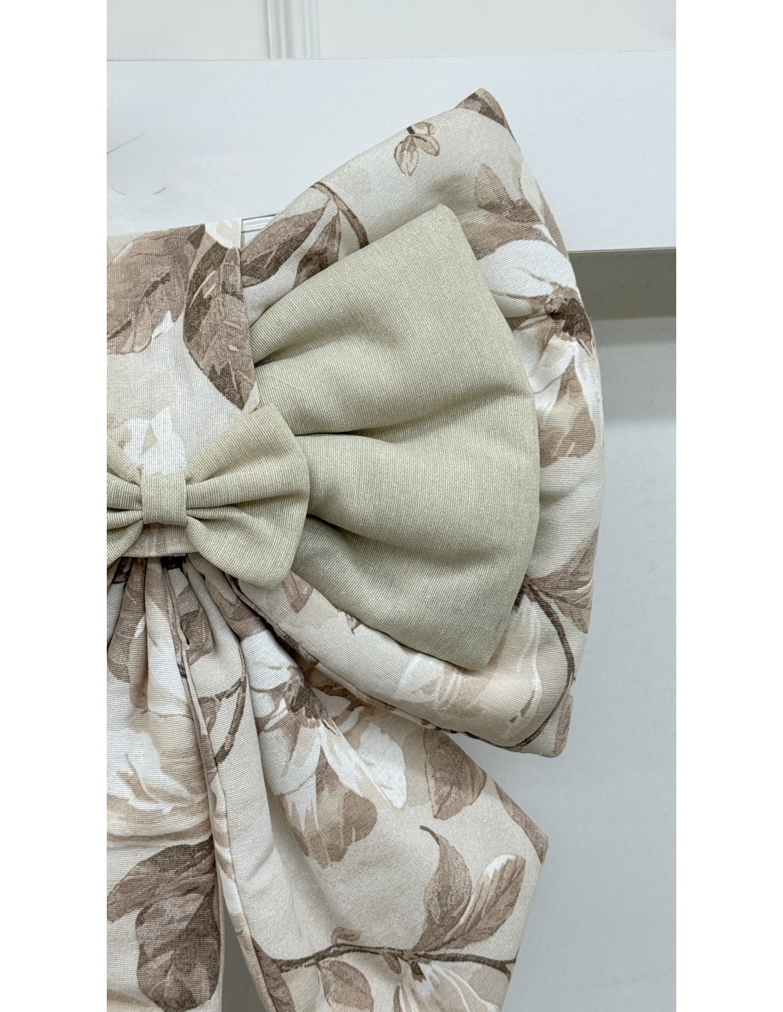 Il fiocco è realizzato in cotone avorio e tessuto fiorato, dettaglio che richiama lo stile romantico e artigianale della collezione Dolce Magnolia.