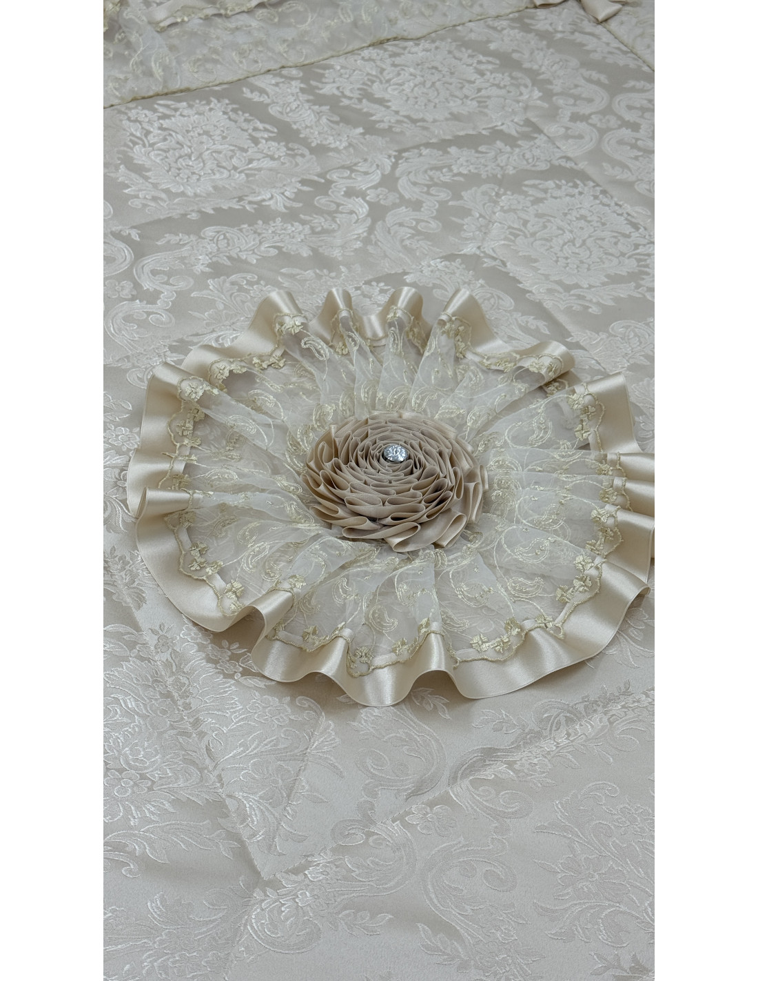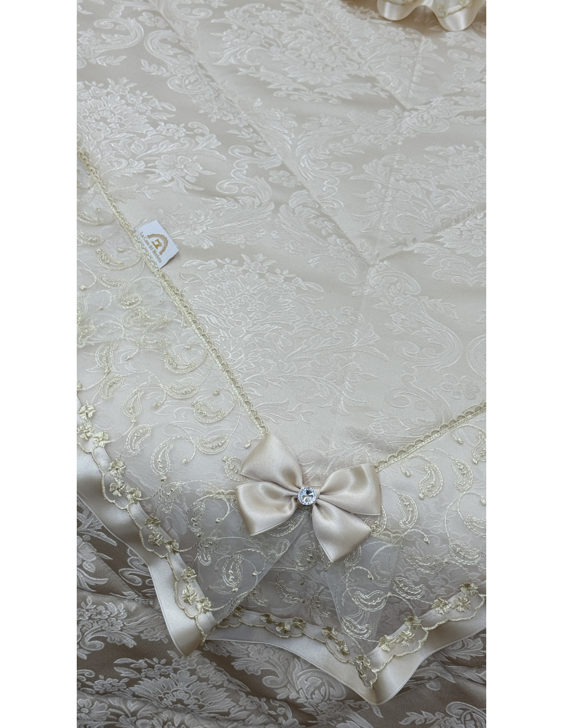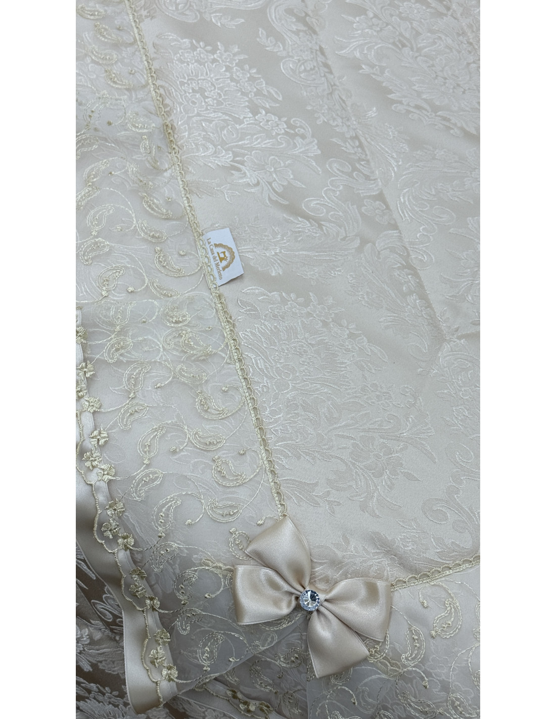Realizzato in pregiata stoffa avorio, si distingue per i suoi delicati dettagli in organza e raso, che creano un effetto romantico ed elegante. Le finiture curate e i particolari decorativi esaltano l’artigianalità, rendendo ogni ambiente accogliente e sofisticato.