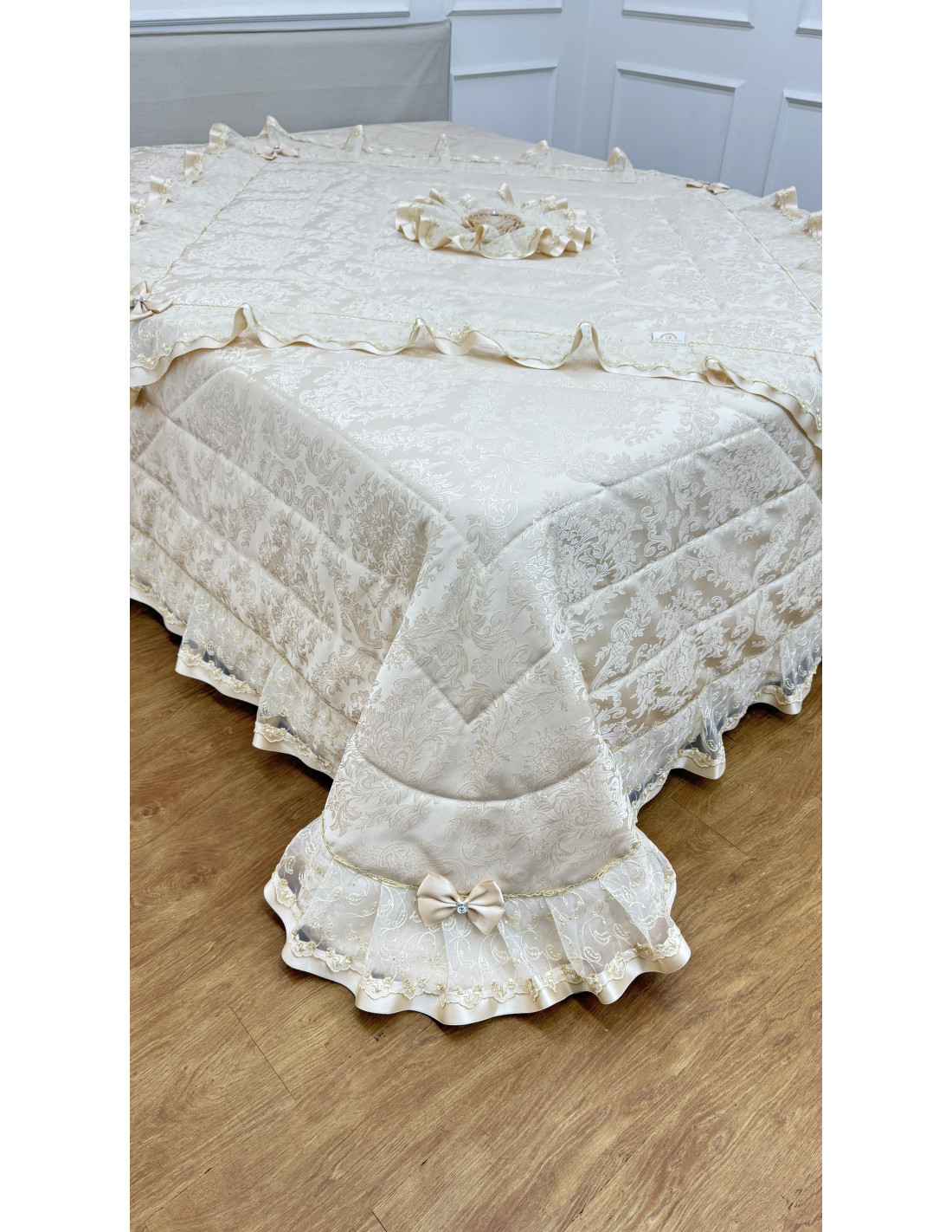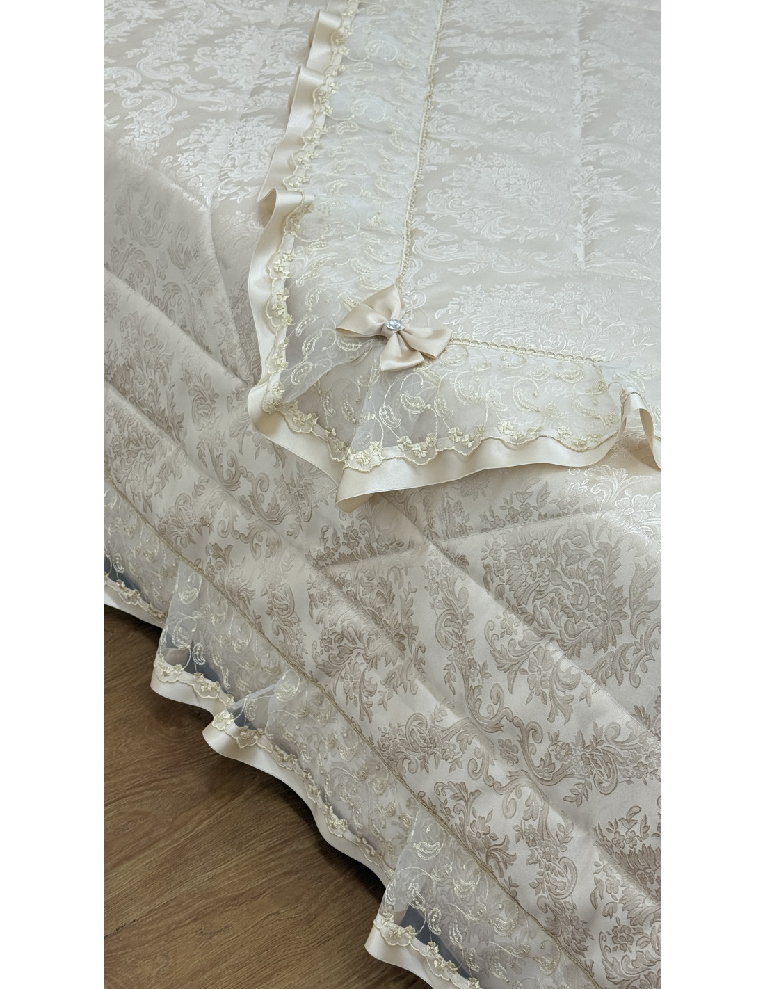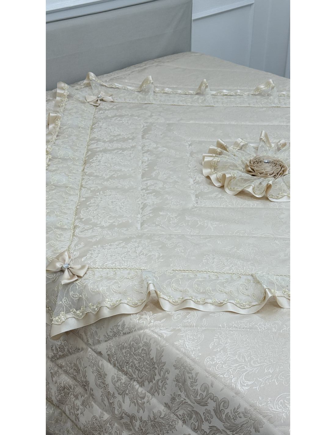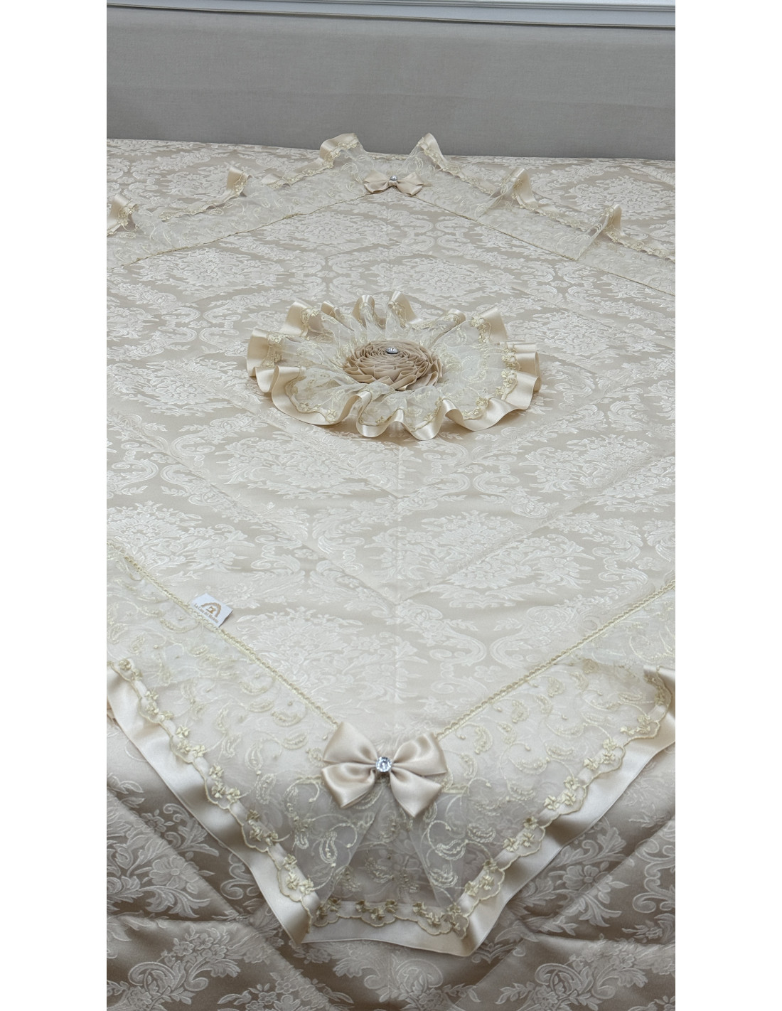Realizzato in pregiata stoffa avorio, si distingue per i suoi delicati dettagli in organza e raso, che creano un effetto romantico ed elegante. Le finiture curate e i particolari decorativi esaltano l’artigianalità, rendendo ogni ambiente accogliente e sofisticato.