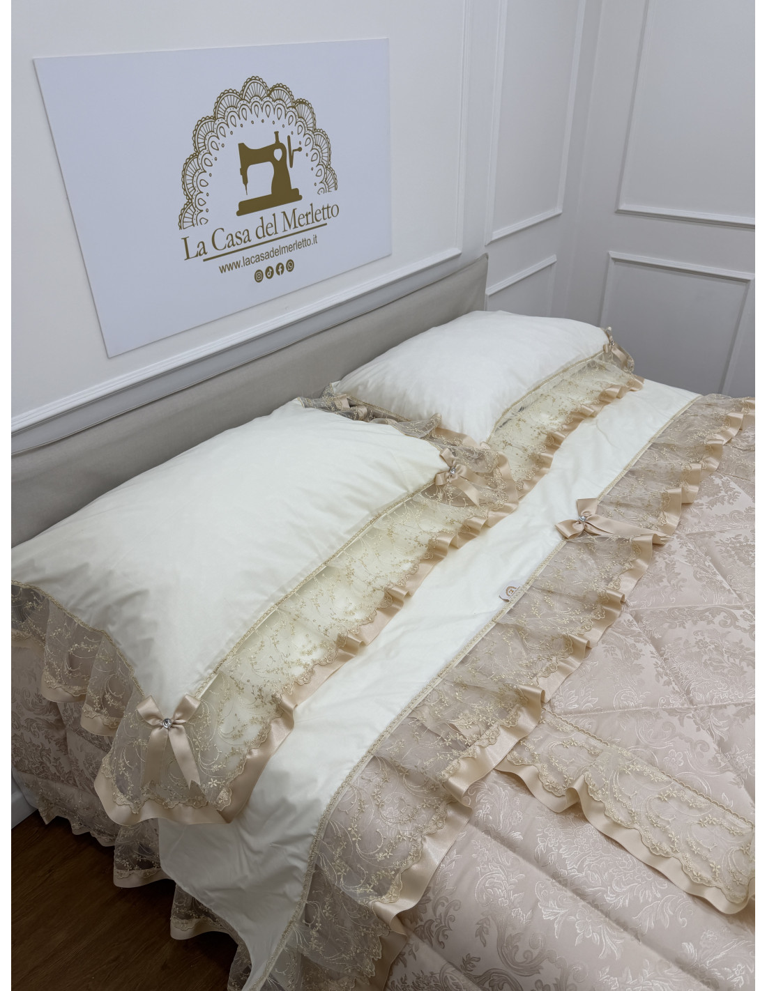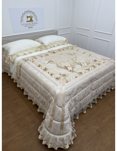 Il set contiene : piumone matrimoniale in stoffa avorio con doppia balza di organza e raso, lenzuola in cotone avorio, composto da un lenzuolo sotto CM 175x200+25, lenzuolo sopra CM 240x290 e due federe di guanciali 50x80 più ricamo, tutto rifinito con merletto in organza avorio e fiocchi in avorio, e tris centri