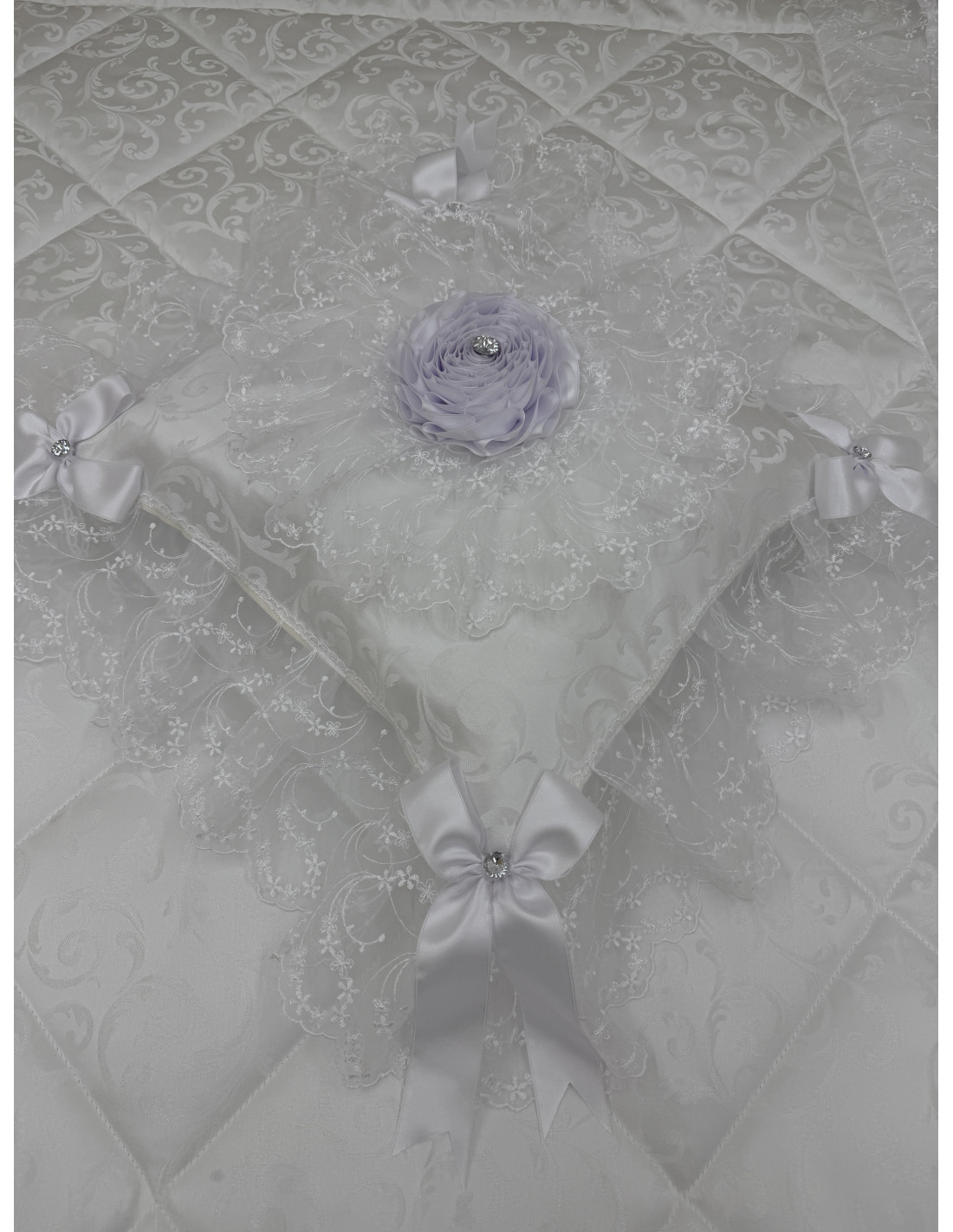 Il set contiene : piumone matrimoniale in stoffa bianca con organza,CUSCINO 40X40cm con coccarda e fiocchi e coppia di federe guanciali 55x85 cm senza anima interna. .
