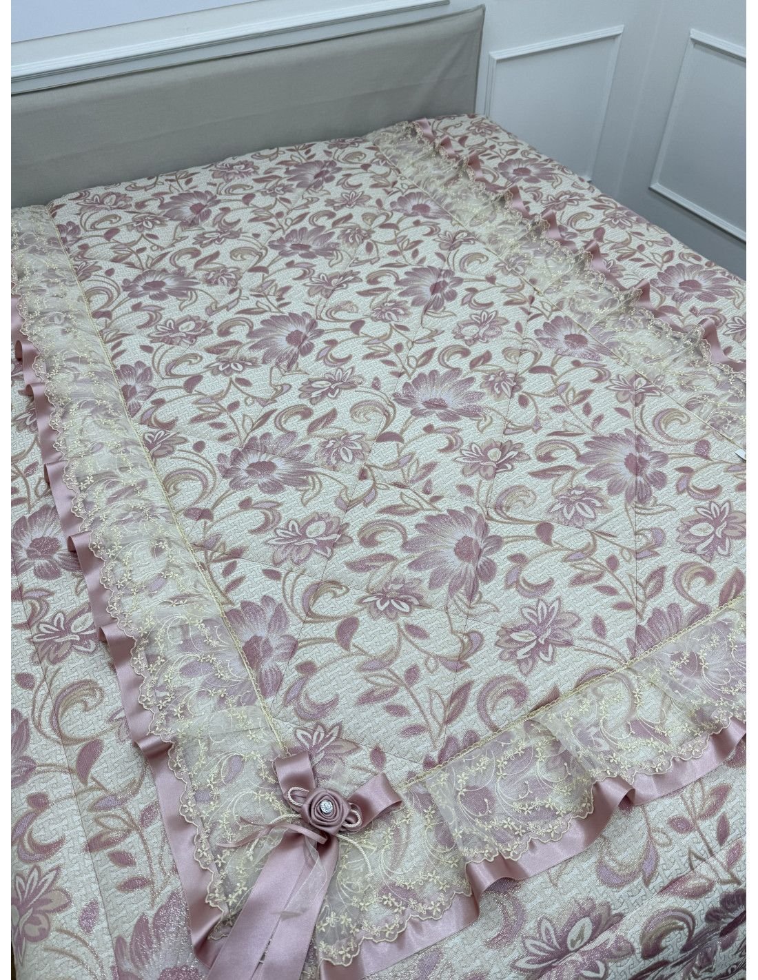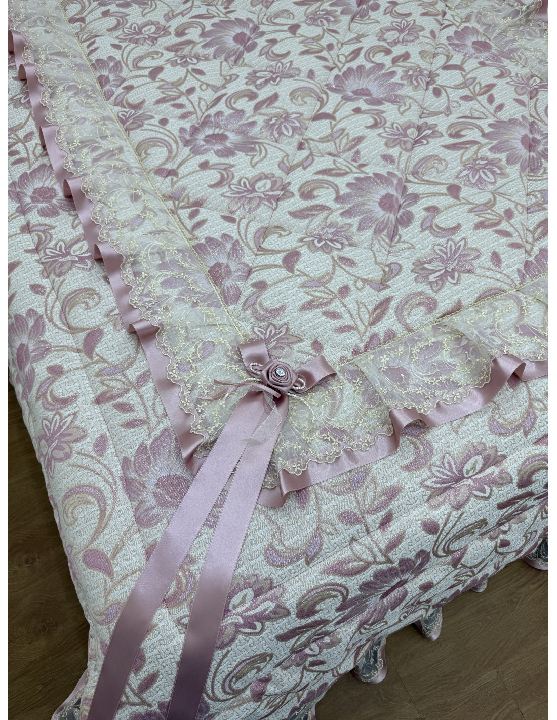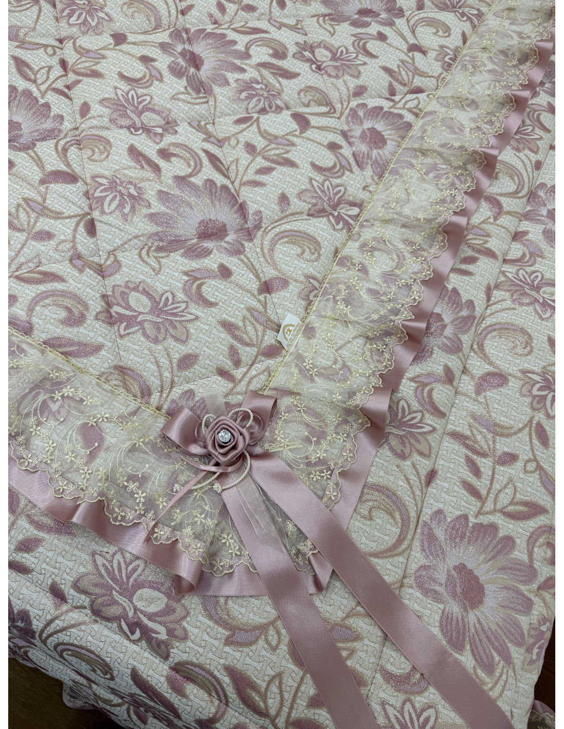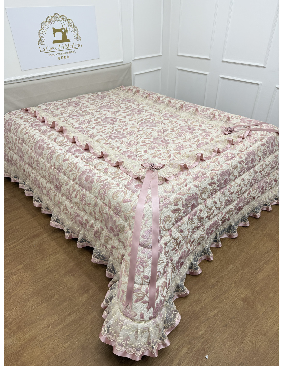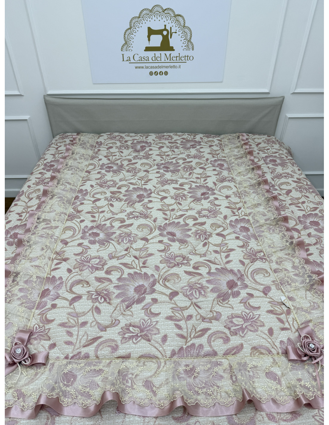 Piumone matrimoniale con doppia balza di organza e raso, impreziosito da fiocchi, rose applicate e Swarovski.