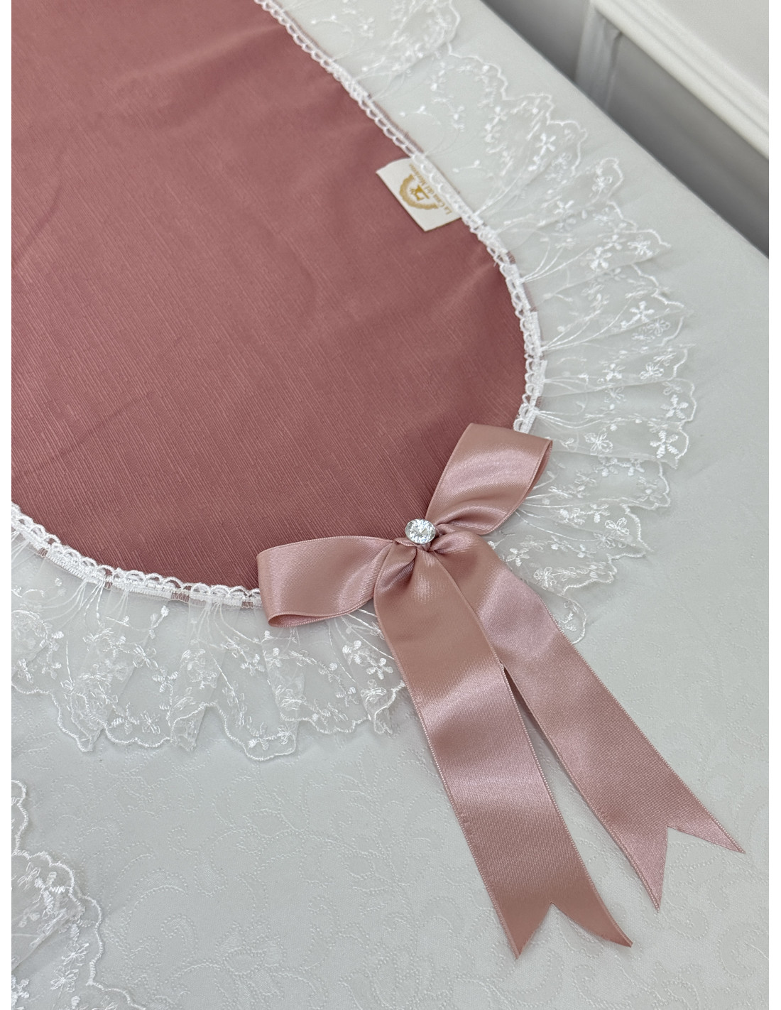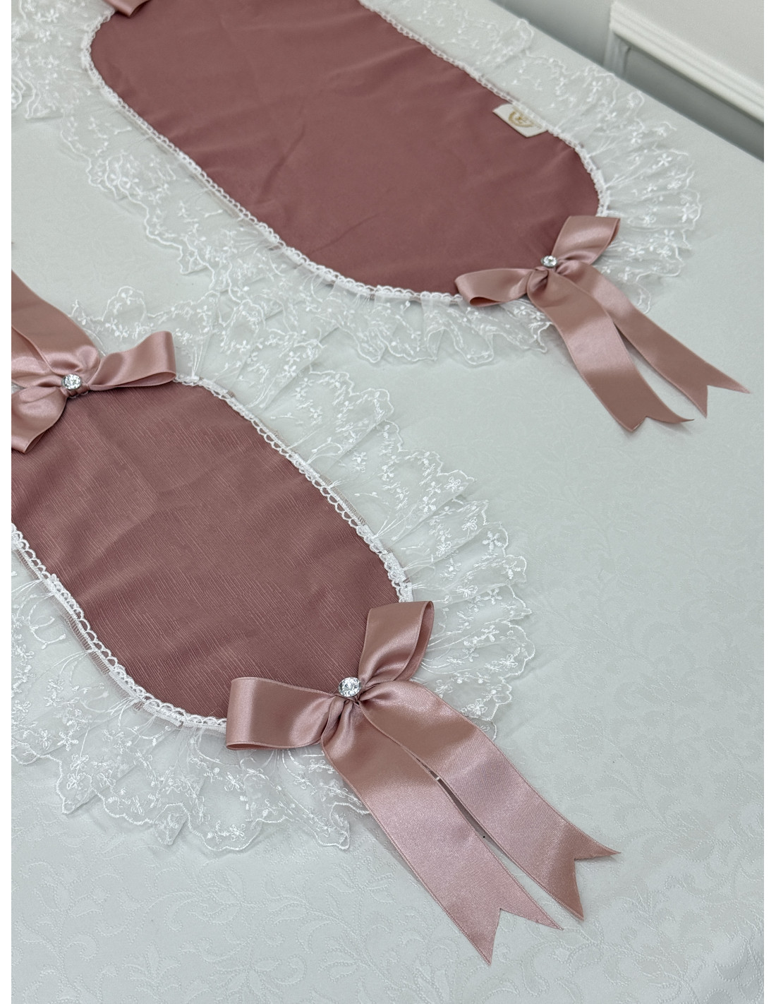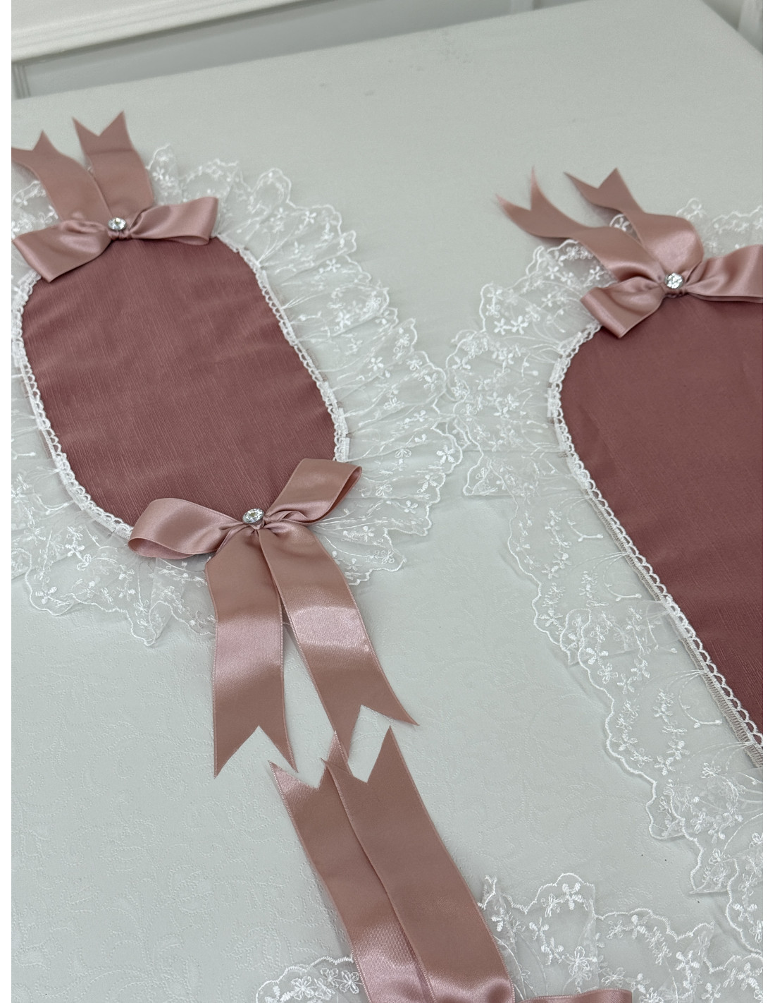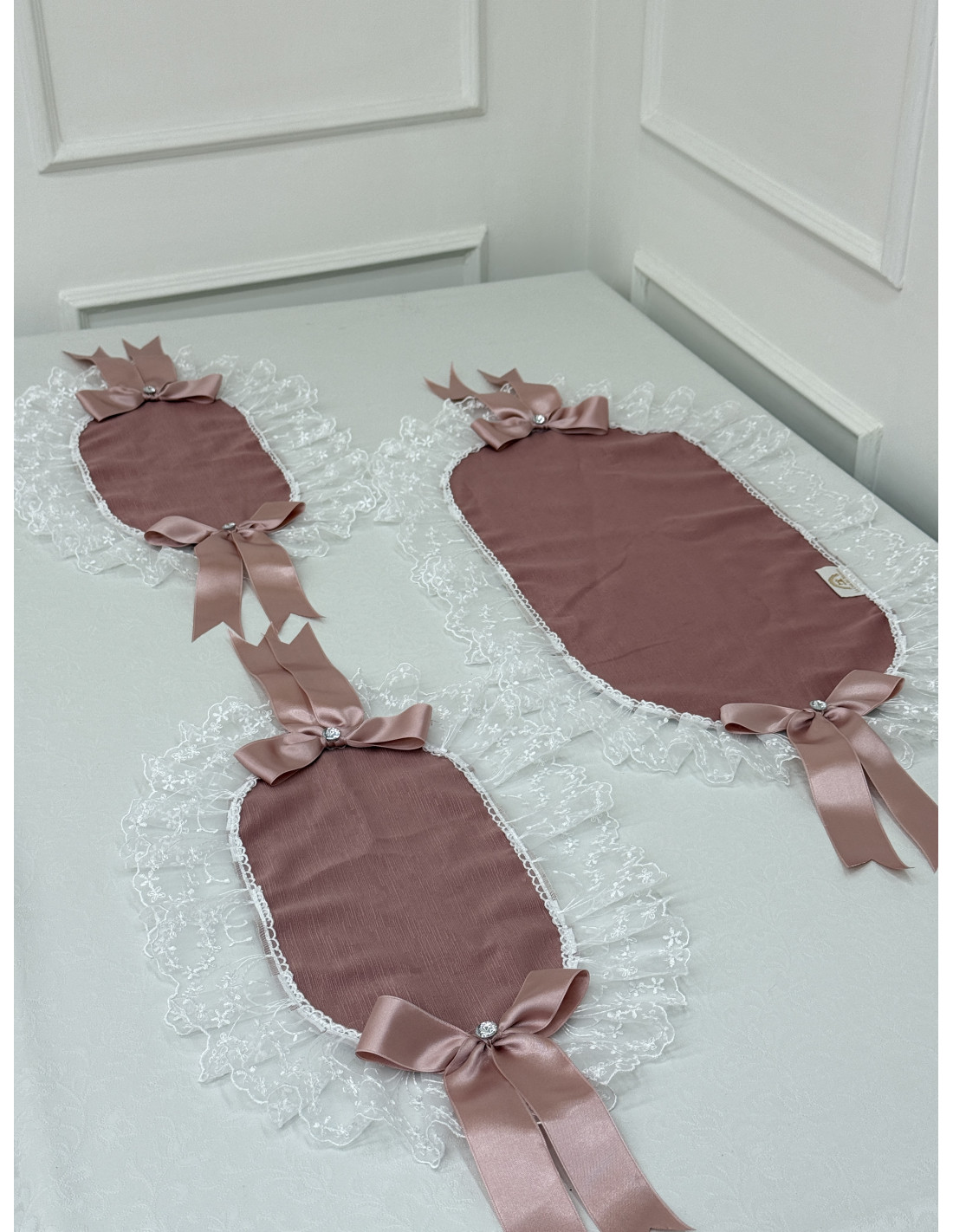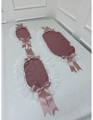 Tris di centri composto da due piccoli e uno grande. Stoffa rosa ,rifinito con organza e fiocchi in raso con Swarovsky
